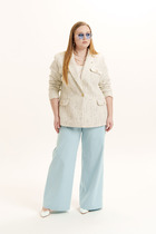 Жакет — словно архитектура уверенности. Полуприлегающий силуэт подчёркивает фигуру, а однобортная застёжка на две пуговицы добавляет лаконичности. Воротник пиджачного типа с овальными лацканами — дань классике, а декоративный кант по краю борта, воротника и клапанов — изысканная деталь, которая делает образ выразительным. Подкладка из ткани в клетку — скрытая игра фактур, доступная лишь тем, кто умеет видеть стиль в деталях.