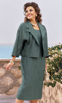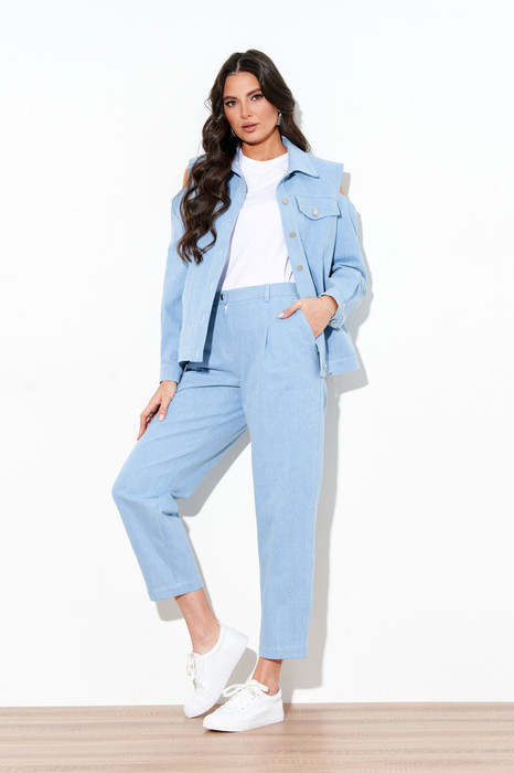 Джинсовый женский костюм с брюками и курткой. Куртка свободного силуэта с рубашечным воротником и втачными рукавами с фигурными вырезами, по переду сверху имитация карманов, в боковых швах функциональные карманы, застежка-планка на петли и пуговицы. Брюки "бананы" с мягкими складками по переду заужаются к низу; пояс притачной на резинке по бокам; застежка на молнию, петлю и пуговицу; карманы в боковых швах и по спинке изделия