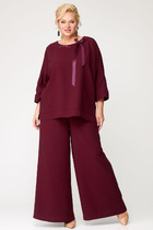 Джемпер прямого силуэта с воротником поло. Рукав втачной одношовный. По низу изделия, по низу рукава и по воротнику проложена отделочная строчка. Брюки расширеные книзу на притачном поясе. По поясу настрочены шлевки. По передним и задним частям брюк вытачки. На задних частях брюк настрочены карманы. Карманы, вытачки, пояс, низ брюк отделаны отделочной строчкой. Длина брюк с учетом пояса - 109 см, длина джемпера- 66 см, длина рукава - 30 см,