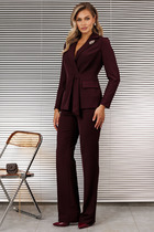 Костюм состоит из жакета и брюк из мягкой вельветовой  ткани приятного цвета морского неба. Жакет полуприлегающего силуэта.  Застежка однобортная на две пуговицы, воротник пиджачного типа.  Перед с талиевой вытачкой, рельефом и декоративным клапаном. Спинка с рельефами из проймы и средним швом.  Рукав втачной двухшовный. Жакет на подкладке. Брюки палаццо с притачным поясом . Спереди застежка гульфик на молнии и петлей и пуговицей по поясу. По задней частям брюк вытачки. Пояс с резинкой в боковых частях. Брюки с заутюженными стрелками. Длина жакета - 68 см, длина рукава жакета - 60 см. Длина брюк с учетом пояса - 109 см.