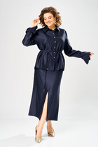 Костюм состоит из жакета и брюк из мягкой вельветовой ткани приятного цвета морского неба. Жакет полуприлегающего силуэта. Застежка однобортная на две пуговицы, воротник пиджачного типа. Перед с талиевой вытачкой, рельефом и декоративным клапаном. Спинка с рельефами из проймы и средним швом. Рукав втачной двухшовный. Жакет на подкладке. Брюки палаццо с притачным поясом . Спереди застежка гульфик на молнии и петлей и пуговицей по поясу. По задней частям брюк вытачки. Пояс с резинкой в боковых частях. Брюки с заутюженными стрелками. Длина жакета - 68 см, длина рукава жакета - 60 см. Длина брюк с учетом пояса - 109 см.