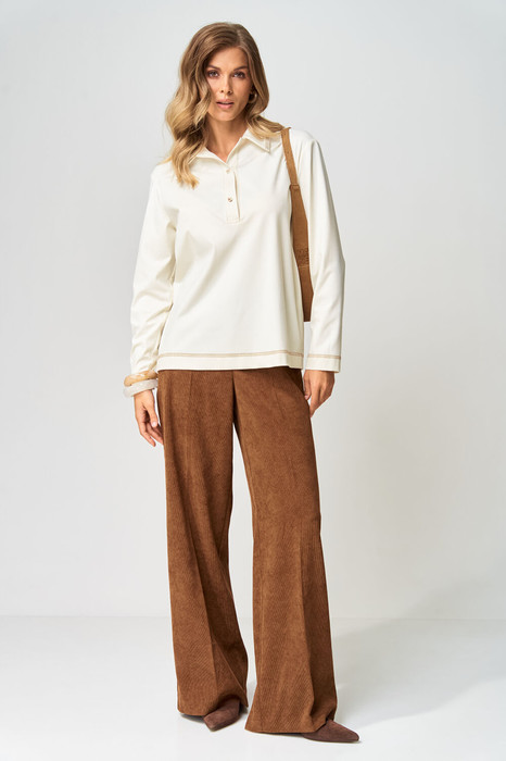 Джемпер прямого силуэта с воротником поло из плотной хлопковой ткани "двухнитка". Рукав втачной одношовный. По низу изделия, по низу рукава и по воротнику проложена отделочная строчка.  Брюки палаццо с притачным поясом из мягкой вельветовой ткани. Спереди застежка гульфик на молнии и петлей и пуговицей по поясу. По задней частям брюк вытачки. Пояс с резинкой в боковых частях. Брюки с заутюженными стрелками. Длина джемпера- 66 см, длина рукава - 60 см. Длина брюк с учетом пояса - 109 см.