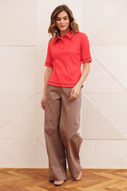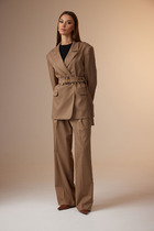 Костюм состоит из джемпера и брюк. Джемпер приталенного силуэта с воротником поло из трикотажного полотна. Рукав втачной одношовный.Брюки расширеные книзу на притачном поясе. По поясу настрочены шлевки. По передним и задним частям брюк вытачки. На задних частях брюк настрочены карманы. Карманы, вытачки, пояс, низ брюк отделаны отделочной строчкой. Длина брюк с учетом пояса - 109 см, длина джемпера - 57 см, длина рукава - 27 см.