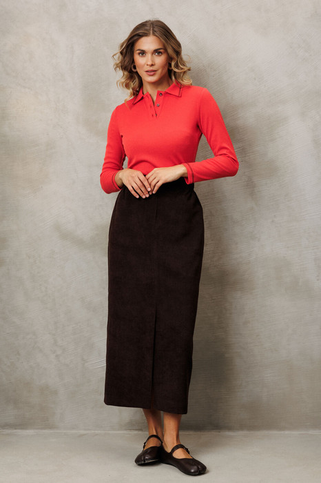 Костюм состоит из джемпера и юбки. Джемпер приталеного силуэта с воротником поло из  трикотажного полотна. Рукав втачной одношовный.  Длина джемпера - 57 см, длина рукава - 60 см. Юбка прямого силуэта выполненная из мягкой вельветовой ткани. Передняя честь юбки с вытачками, со средним швом и застежкой гульфиком на молнии и щлицей спереди. Задняя часть юбки с вытачками. Юбка на притачном поясе с затежкой на петлю и пуговицу спереди и резинками по бокам. Юбка на подкладке. Длина юбки с учетом пояса - 90 см.