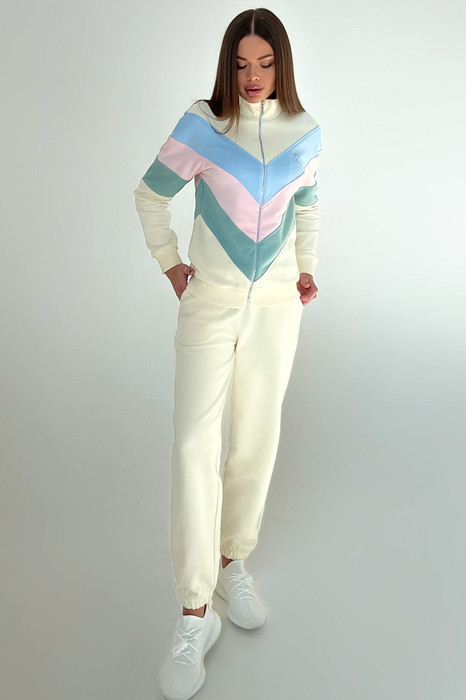 Джемпер с дизайнерскими, наклонными резами и на переде, и на спинке, выполненных из разных контрастных оттенков. Рукава визу имеют манжеты. Воротник-стойка, манжеты, низ джемпера выполнены из ткани-компаньена кошкорсе. На левом переде вышит логотип в цвет полоски. Брюки имеют современный крой и облегание, удобные карманы на передних половинка, притачной пояс и резинку внутри. Низ брюк присобран на резинку.