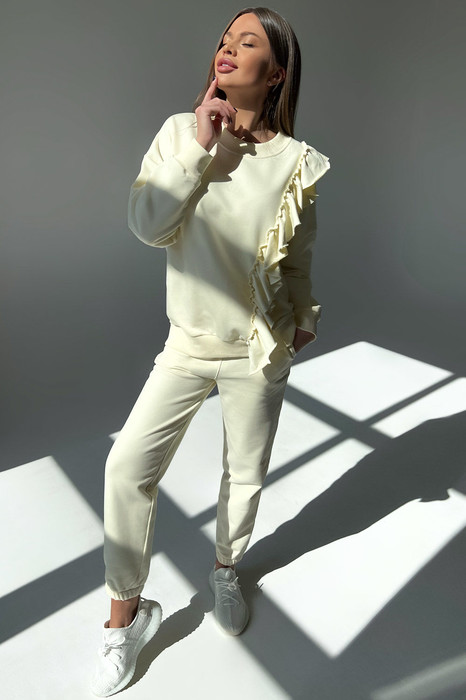 Современный, женственный костюм, покроя oversize из комфортной ткани (футера пенье). Костюм состоит из джоггеров и свободного свитшота с воланом. Волан с необработанным краем (укреплён строчкой для надежности) пришит асимметрично на левой стороне изделия. Свитшот имеет спущенную линию плеча, прямой силуэт и притачную манжету по низу изделия. По центру переда вышивка – логотип в цвет ткани. Рукава с притачной по низу манжетой. Бейка горловины, низ изделия и манжеты рукавов выполнены из ткани - компаньона кошкорсе. Брюки с притачным поясом, резинкой внутри. Передняя половинка брюк с удобными боковыми карманами. Низ брюк присобран на резинку.