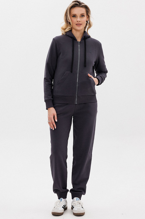 Классический женский спортивный костюм состоит из худи на застёжке-молнии и брюк на манжетах. Всесезонная ткань сделает его любимым в Вашем гардеробе как для дома, так и улицы.