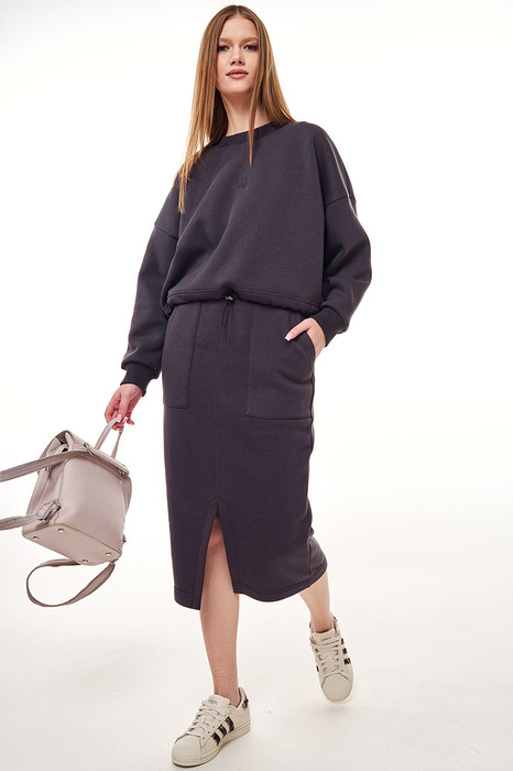 Современный комфортный костюм, состоит из зауженной юбки и укороченного свитшота. Отлично подойдёт для офиса, прогулок и путешествий. Пошит из теплой, комфортной ткани. Свитшот покроя оверсайз со спущенной линией плеча. Горловина, манжеты рукавов выполнены из ткани-компаньона кошкорсе. По центру переда вышивка-логотип в цвет ткани. Свитшот с кулисой по низу с резинкой внутри и фиксатором по центру переда. Юбка зауженная к низу, облегающая фигуру, длиной миди. Перед с удобными боковыми карманами, по центру переда разрез с отделочной строчкой. Пояс из ткани кошкорсе с резинкой внутри.