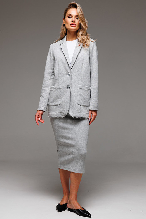 Костюм Gowear из футера в стиле smart casual поможет создать в меру строгий и одновременно расслабленный образ. Костюм состоит из жакета и юбки из эластичной ткани кошкорсе. Жакет прямого силуэта с воротником и лацканами, имеет удобные карманы и застежку на 2 пуговицы. На левом лацкане вышивка-логотип в контрастном цвете. Низ и борта имеют открытые края (эффект необработанного шва), укреплены дополнительной строчкой. Жакет без подкладки. Юбка прямая, облегающая фигуру с разрезом на спинке. Пояс цельнокроенный с резинкой внутри.