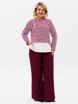 Жакет с центральной застежкой на петли и пуговицы, отложным врортником и лацканами пиджачного типа. По переду с нагрудными вытачками, накладными карманами. По спинке со средним швом. Рукав втачной, корокий. Юбка с отрезным поясом, застежкой на потайную молнию по среднему шву заднего полотнища. По переднему полотнищу односторонняя складка, закрепленная к детали петлями и пуговицами, по низу переднего полотнища- шлица. Задняя половинка со средним швом, талиевыми вытачкам. В области спинки пояс присборен на резинку.