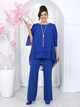 Блузка с центральной застежкой на петли и пуговицы, втачным воротником с отрезной стойкой. По переду нагрудные вытачки . Спинка цельная. Рукав втачной, короткий, с отрезной манжетой. Брюки- с цельнокроенным поясом. Пояс присборен на резинку, с кулисой и шнуром- завязкой. В боковых швах расположены карманы. Ниже линии бедер расположены накладные карманы с клапанами.