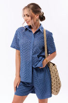 Блузка с втачным воротником с отрезной стойкой, центральной застежкой на петли и пуговицыпо отрезной планке. Плечо спущенное, рукав втачной, короткий. Шорты прямые, с отрезным поясом, пояс присборен на резинку.