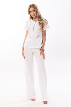 Блузка с центральной застежкой на навесные петли и пуговицы по вставке переда. Воротник отрезной- стойка. По вставке переда- четыре складки- защипа. Спинка со средним швом. Рукав короткий, цельнокроенный, с отложной манжетой. Брюки- с отрезным поясом. Пояс присборен на резинку. По боковым швам расположены карманы. Вход в карман наклонный к боковому шву.