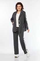 Блузон с центральной застежкой на петли и пуговицы, втачным воротником с отрезной стойкой. По переду с нагрудными вытачками, спинка цельная, по боковым швам- разрезы. Рукав втачной, длинный, с отрезной манжетой. Топ без воротника, с V-образным вырезом горловины. По переду с нагрудными вытачками. Брюки прямые, с отрезным поясом. Пояс присборен на резинку. Передние половинки с карманами. Вход в карман наклонный к боковому шву.