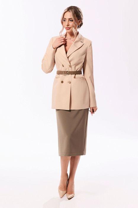 Жакет полуприлегающего силуэта с центральной двубортной застежкой на петли и пуговицы, с втачным воротником и отложными лацканами пиджачного типа. По переду с рельефами, выходящими из проймы, талиевыми вытачками. На уровне линии талии расположены прорезные карманы в рамку . Спинка со средним швом, рельефами, выходящими из проймы. Рукав втачной, длинный. Юбка прямая, с отрезным поясом. Пояс в области спинки присборен на резинку. Переднее полотнище цельное, заднее полотнище со средним швом, заканчивающимся щлицей. Застежка на потайную молнию.