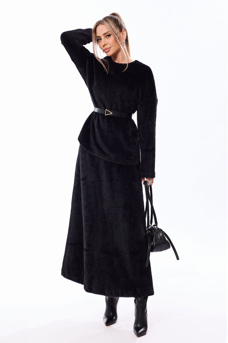 Блузон, без воротника, с круглым вырезом горловины, застежкой на навесную петлю и пуговицу в среднем шве спинки. По спинке со средним швом. Рукав втачной, длинный. Юбка без пояса, по верхнему срезу юбки- резинка. Комплект со съемным поясом.