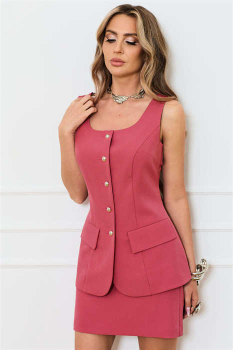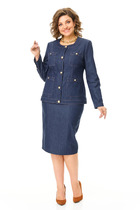 Жилет с центральной застежкой на петли и пуговицы, без вортника, с круглым вырезом горловины. По переду с рельефами, выходящими из проймы до низа, на уровне линии бедер расположены прорезные карманы с листочками и клапанами. По спинке со средним швом и рельефами, выходящими из проймы до низа. Юбка без пояса, верхний срез обработан обтачками. Заднее полотнище со средним швом, застежкой на потайную молнию в среднем шве.