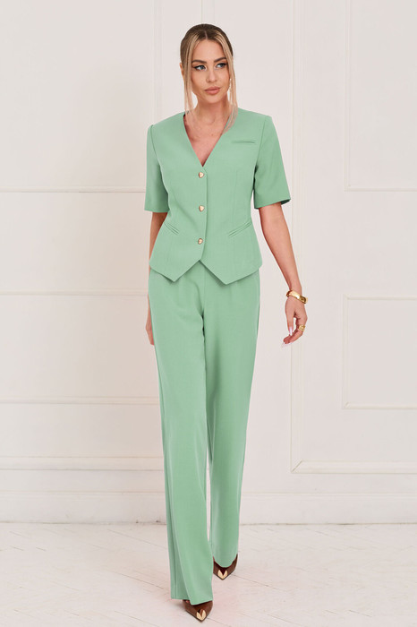 Жакет с центральной застежкой на петли и пуговицы, без воротника, с V-образным вырезом горловины. По переду с талиевыми вытачками и рельефами, выходящими из проймы, прорезными карманами в рамку, расположенными на уровне линии талии. Спинка со средним швом, рельефами, выходящими из проймы. Рукав втачной, короткий. Брюки с отрезным поясом, на поясе по переду расположены декоративные пояски с пряжками. Пояс в области спинки присборен на резинку. Застежка гульфик. По боковым швам расположены карманы. Вход в карман наклонный к боковому шву.
