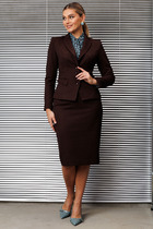 Жакет с центральной двубортной застежкой на пришивные кнопки, без воротника с отложными лацканами. По переду с рельефами, выходящими из проймы, талиевыми вытачками. Спинка со средним швом, рельефами, выходящими из проймы, талиевыми вытачками. Рукав втачной, длинный. Брюки с отрезным поясом, на поясе расположены шлевки. В боковых швах расположены карманы. Вход в карман наклонный к боковому шву. Застежка гульфик. Пояс в области спинки присборен на резинку. Костюм со съемным декоративным поясом. Декоративный пояс из кожзама, декорирован бахромой.