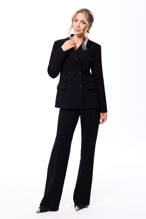 Жакет с центральной двубортной застежкой на петли и пуговицы, отложным воротником и лацканами пиджачного типа. По переду с рельефами, выходящими из проймы, талиевыми вытачками, прорезными карманами с клапанами и двумя обтачками. Спинка со средним швом, рельефами, выходящими из проймы. Рукав втачной, длинный. Брюки с отрезным поясом, на поясе расположены шлевки. В боковых швах расположены карманы. Вход в карман наклонный к боковому шву. Застежка гульфик. Пояс в области спинки присборен на резинку.