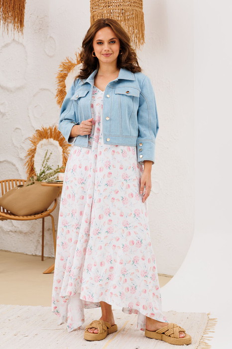 Комплект состоит из жакета и платья. Жакет-джинсовка приталенного силуэта, воротник рубашечный, рукав втачной на широкой манжете со складкой. По переду клапаны и застежка на петли пуговицы.