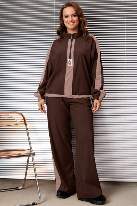Джемпер свободного силуэта, вырез горловины со стойкой и застежкой на тесьму-молнию. Рукав спущенный, длинный. Декором являются лампасы из отделочной ткани. По лицу изделия кулиса из резинки.