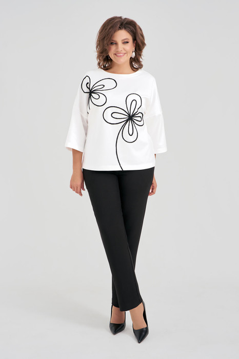 Костюм женский, состоящий из джемпера и брюк. Джемпер свободного силуэта выполнен из мягкого трикотажа, рукава со спущенной лилией плеча, горловина округлой формы, по переду и спинке - декоративная вышивка. Брюки классические выполнены из костюмной ткани и заужаются к низу, пояс на резинке, в боковых швах функциональные карманы, застежка на молнию, петлю и пуговицу.