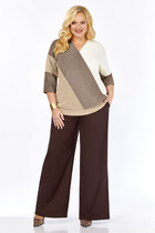 Женский костюм полуприлегающего силуэта, состоящий из рубашки и брюк, выполнен из мягкой костюмной ткани средней плотности. Рукава рубашки со спущенной линией плеча, внутренней патой и манжетой, что позволяет регулировать высоту рукава и представляет собой стильную деталь с изысканным акцентом; воротник рубашечный; по переду накладные клапаны - обманки. Застегивается на петли и пуговицы. Классические брюки прямого силуэта с функциональными карманами в боковых швах, пояс притачной с эластичной тесьмой по спинке для лучшего прилегания; застежка на молнию, петлю и пуговицу. В комплекте съёмный пояс - резинка из основной ткани с пряжкой. Костюм полностью соотвествует заявленному размеру. Пожалуйста, пользуйтесь таблицей замеров готового изделия.