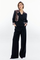 Костюм женский, состоящий из удлиненного жакета и брюк, выполнен из плотной костюмной ткани. Жакет на подкладке полуприлегающего силуэта до линии колена; рукава втачные; горловина V- образной формы; по переду рельефы и функциональные прорезные карманы; застежка на потайные пришивные кнопки. Зауженные к низу брюки полуприлегающего силуэта застегиваются на молнию, петлю и пуговицу; пояс притачной с резинками в боковых швах для лучшего прилегания; на передних половинках функциональные карманы. В комплекте съемный пояс из основной ткани. Костюм полностью соответсвует заявленному размеру. Пользуйтесь таблицей замеров готового изделия.