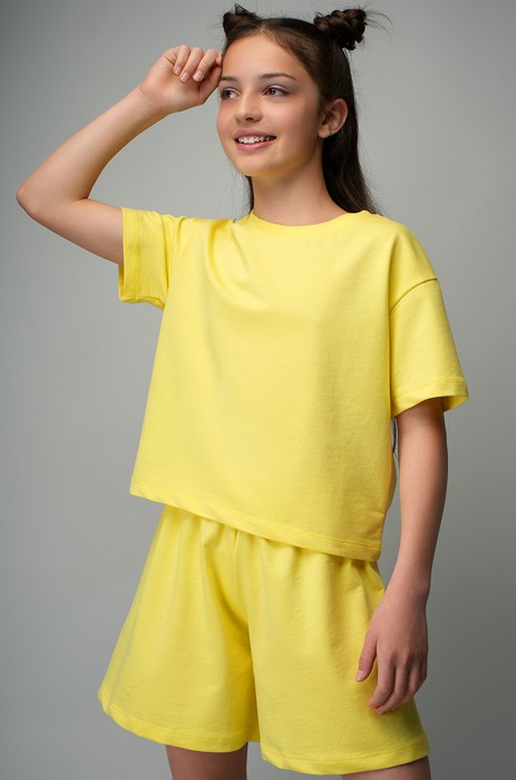 Яркий жёлтый костюм для девочки и девочки подростка создан, чтобы лето запомнилось абсолютным комфортом. Укороченная футболка и шортики клеш — идеальный тандем для активных и свободных от условностей подростков.
