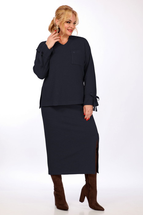 Комплект женский изготовлен из трикотажного полотна. Джемпер свободного силуэта, горловина V-образной формы обработана планкой. Перед с нагрудным карманом, декорированным вышивкой. Спинка цельнокроенная. Рукав спущенный к низу затягивается тесьмой. Низ джемпера с перепадом длины, по боковым швам разрезы. Юбка заужена к низу, пояс цельнокроенный на резинке. По переду обработан ассиметричный рельеф, в котором имеется шлица.
