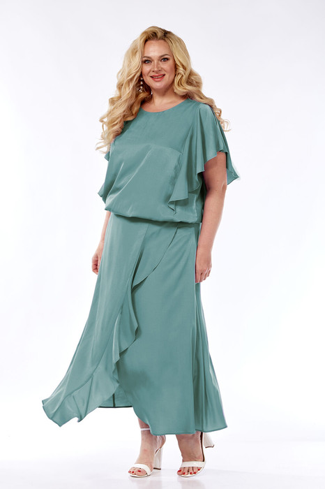 Костюм женский нарядный, выполнен из легкой натуральной ткани. Состоит из блузки свободного силуэта и юбки А-силуэта. Горловина блузки округлой формы. По переду и спинке рельефы которые оформлены воланами переходящими в рукава крылышки. На спинке вырез-капля. Низ блузки на резинке. Юбка с запахом дополнена воланом. Пояс притачной на резинке. Юбка на подкладке.