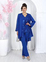 Костюм брючный, изготовлен из костюмной ткани. Жакет прямого силуэта. Горловина обработана воротником-стойкой, застежка центрально-бортовая на петли и пуговицы. На полочке нагрудные вытачки, обработаны карманы. Рукава спущенные, длинные. Брюки свободного кроя, пояс притачной, сзади на резинке. Застежка на тесьму-молнию и петлю пуговицу. На передних частях брюк в подрезных деталях обработаны карманы.