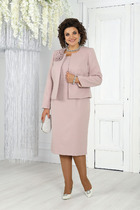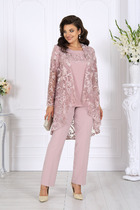 Костюм брючный двухпредметный, повседневно-нарядный, выполнен из ткани с мерцающим эффектом. Состоит из блузы и брюк. Блуза свободного силуэта. Воротник рубашечного типа, застежка центральная на петли и пуговицы. С левой стороны настрочной карман. Спинка с притачной кокеткой и встречной складкой. Рукава спущенные, по низу складки и широкая притачная манжета. Низ блузы фигурный. Брюки прямые, пояс притачной на резинке. В брюках обработаны карманы.