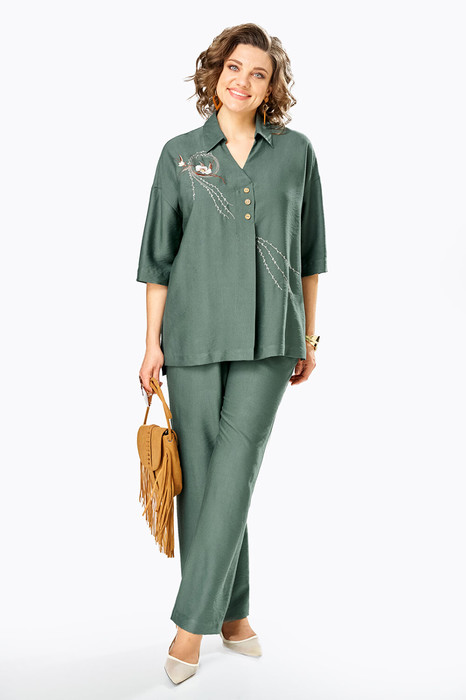 Костюм брючный, двухпредметный, состоит из блузы и брюк. Выполнен из ткани с эффектом крэша. Блуза свободного силуэта с горловиной V-образной формы и стояче-отложным воротником. По переду обработана односторонняя складка с имитацией застежки. Спинка с фигурными подрезами, в районе талии, по центру кулиса присобранная на эластичную тесьму. Рукава спущенные. Блуза декорирована дизайнерской вышивкой. Брюки прямого кроя, классической посадки. Пояс притачной на эластичной тесьме. В передних деталях брюк обработаны карманы с подрезным бочком.