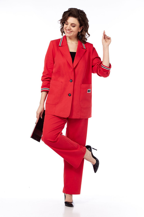 Костюм брючный 2х — предметный, состоит из жакета и брюк, из костюмной ткани. Жакет прямого силуэта с воротником пиджачного типа, застежка однобортная на две петли с пуговицами. По переду обработаны рельефы и накладные карманы. Спинка со средним швом, в котором обработана шлица. Рукава втачные, двухшовные, дополнены отложной манжетой из отделочной ткани. Брюки средней посадки, прямые от бедра. Пояс притачной с застежкой на петлю и пуговицу. По передним деталям брюк обработаны  карманы, которые дополнены декоративными элементами. Задние  детали брюк на кокетке, имеются фигурные накладные карманы. Костюм по швам декорирован отделочными строчками.