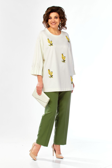 Комплект брючный двухпредметный, состоит из джемпера и брюк. Джемпер свободного силуэта выполнен из трикотажного полотна. Горловина обработана бейкой. Перед и спинка цельнокроеные. Рукава спущенные, по низу застрочены защипы . Джемпер декорирован дизайнерской вышивкой. Брюки классической посадки, выполнены из костюмной ткани. Пояс притачной, частично на эластичной тесьме, застежка на петлю и пуговицу. В передних деталях обработаны карманы с подрезным бочком.