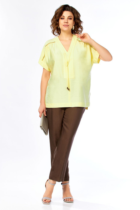 Костюм брючный двухпредметный, состоит из  блузки и брюк. Выполнен из ткани с эффектом крэша. Блузка свободного кроя, горловина V-образной формы, с декоративной планкой в которой вставлен шнур с наконечниками. Полочка со сборкой от кокетки. По спинке кокетка и обработаны складки. Рукава цельнокроеные с притачными манжетами по низу . В боковых швах разрезы. Перед и спинка разной длинны. В качестве декора кружево в шве кокетки. Брюки свободного кроя. Пояс частично на резинке, застежка на тесьму-молнию и петлю пуговицу. По передним деталям брюк обработаны карманы в декоративных подрезах.