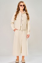 Костюм женский, состоящий из жакета и юбки. Жакет прямого силуэта без подкладки, длиной до линии бедра. По переду жакета настрочены накладные карманы с встречными складками. В шве притачивания кокетки расположен клапан кармана, застегивающийся на петлю и пуговицу. В среднем шве спинки расположена встречная складка. Рукав втачной одношовный, прямой. По низу рукава расположена пата, застегивающаяся на петлю и пуговицу. По низу жакета обработан отрезной пояс. Горловина обработана втачным воротником с лацканами. Застежка центральная , однобортная на петли пуговицы. Юбка женская на подкладке  А – силуэта длиной до середины икры. По переду юбки заложены встречные складки и нстрочены клапаны  с декоративными пуговицами. Спинка юбки цельная. Карманы обработаны в боковом шве юбки. По левому боковому шву юбки находится застежка – молния.  Верхний срез юбки обработан притачным поясом с резинкой по спинке.