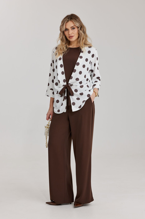 Костюм женский из плательно-костюмной струящейся ткани, состоящий из брюк, топа и блузона