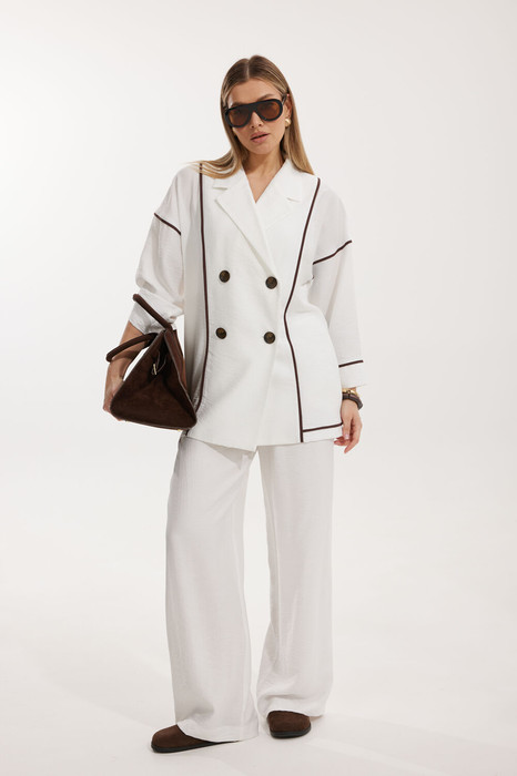 Жакет женский двубортный без подкладки прямого силуэта со спущенной линией плеча длиной за линию бедра. Перед жакета состоит из центральной и боковой части, между ними вставлен контрастного цвета отделочный кант. Спинка состоит из центральной и боковых деталей, в швах располагаются детали канта, контрастного цвета. Рукав втачной одношовный, по низу рукава пришита отрезная манжета, в швах располагается контрастный кант. Горловина обработана отрезным воротником с лацканом. Застежка двубортная на отделочные контрастные пуговицы.