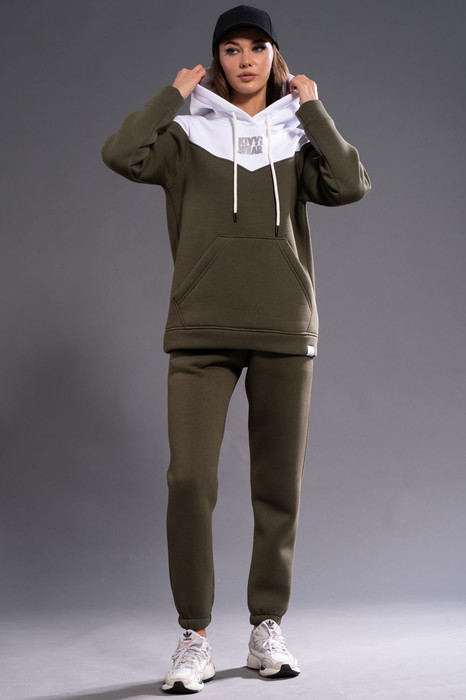 Худи с двухцветным дизайном привлекает внимание благодаря отделочной кокетке. Она добавляет неповторимости и стиля этому утепленному комплекту.