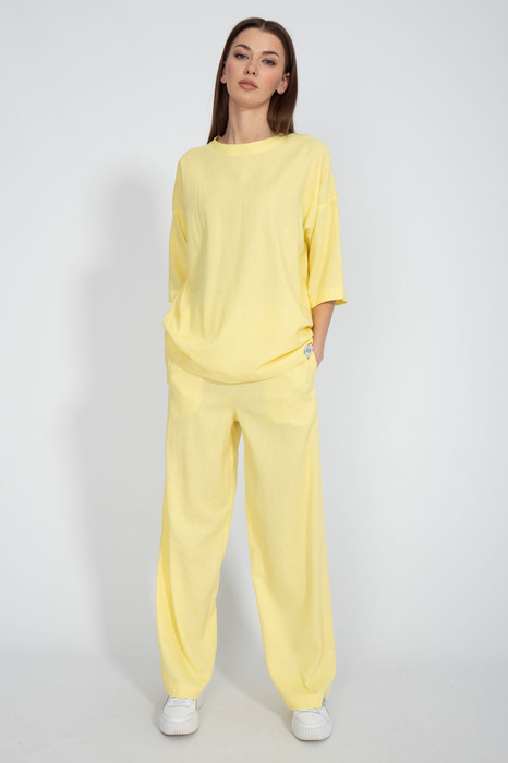 Костюм состоящий из брюк прямого свободного кроя с карманами в боковых швах и джемпера свободного кроя. С приспущенным рукавом и кулиской по низу изделия с возможностью регулировки ширины низа. Ткань лен. Отлично сочетается с шортами модели 4074, рубашкой 4073, рубашкой 4081, джоггерами 4082.