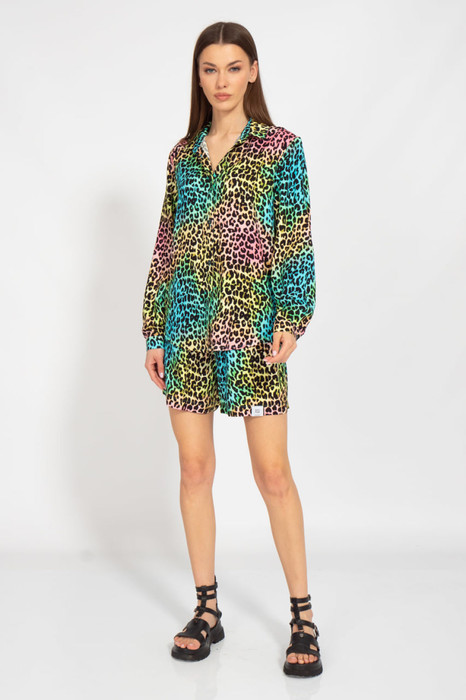 Костюм. Рубашка вискоза полуприлегающего силуэта с втачными рукавами, удлиненная по спинке. Обработка низа рубашки в форме овала. Шорты вискоза свободного кроя. Карманы в боковых швах.