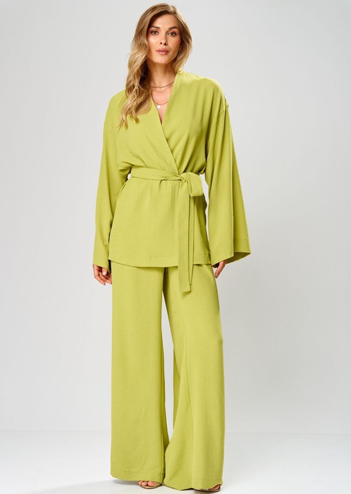 Жакет женский из мягкой костюмно-плательной ткани с креш-эффектом, свободного силуэта, длиной ниже линии бедер, со спущенной линией плеча, с втачными рукавами, в боковых швах обработаны разрезы, со съемным поясом. Детали переда жакета с отрезными бочками. Деталь спинки жакета с втачной стойкой, переходящей на перед. Рукава втачные одношовные, широкие. По боковым швам на уровне линии талии прикреплены шлевки для протяжки съемного пояса.