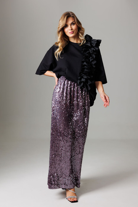 Элегантный комплект, состоящий из майки оверсайз с объемным ассиметричным воланом и длинной юбки с мерцанием и разрезом в среднем шве.