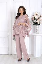 Брюки комплекта созданы в свободном стиле палаццо. В пояс брюк по спинке вставлена эластичная тесьма, шириной 3 см. Спереди пояс фиксируется горизонтально на петли/пуговицы и вертикалную закрытую клапан-молнию (гульфик).