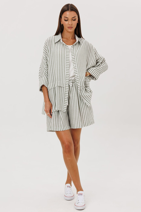 Стильный легкий комплект, состоящий из блузона стиля oversize, майки и шорт современного свободного силуэта. Подходящий вариант на предстоящее лето!