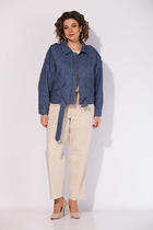 Жакет прямого свободного силуэта на подкладке. На полочке изделия расположены вертикальные выточки и притачные боковые детали. Фронтально горизонтально расположены функциональные прорезные карманы с листочкой и клапаном. Горловина оформлена глубоким английским отложным воротником с лацканами. На спинке жакета расположена открытая высокая шлица (38 см) в среднем шве изделия, которая закреплена нефункциональными пуговицами. Длина изделия жакета по среднему шву жакета 69-71 см (в зависимости от размерного ряда). Рукав двухшовный, длиной 60-61 см.