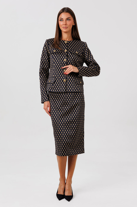 Классический комплект в стиле «Шанель», состоящий из жакета и юбки прилегающего силуэта на подкладке.